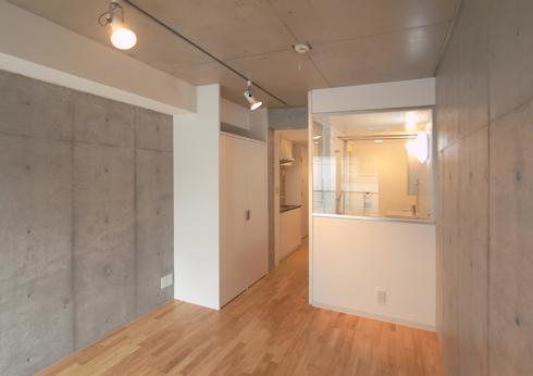 賃貸住戸の仕上は、将来のメンテナンスも考慮して、コンクリート打放しとボードに塗装としています。インテリアは、ガラス間仕切りで風呂を囲い視線を遮らないようにするなどの工夫をして、明るさや広さを演出しています。