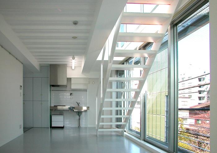 1階を店舗、2~4階に賃貸住宅を計画しました。2階はワンルームタイプが2戸、3,4階はメゾネットタイプの住戸が2戸です。4階には大きな屋上テラスを持っています。緑がかッた透明なスクリーンをストライプ状に配置し、町並みにアクセントを与えています。