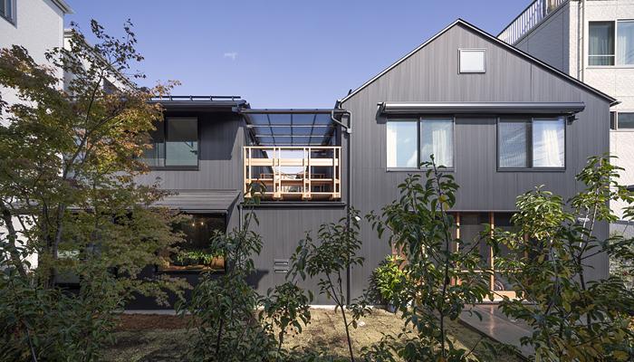 親世帯と子世帯の家を、中庭テラス、物干しテラス、屋上庭園の三つの屋外空間で分け、共用の玄関・浴室の内部空間でつないだ二世帯住宅です。