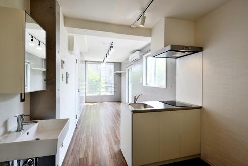 16戸のスタジオタイプの集合住宅です。住戸の玄関部にキッチンを配置することで20㎡の部屋が廊下のない広がりある空間になりました。打放しコンクリートの質感を生かした室内です。ローコストを追求した建物です。