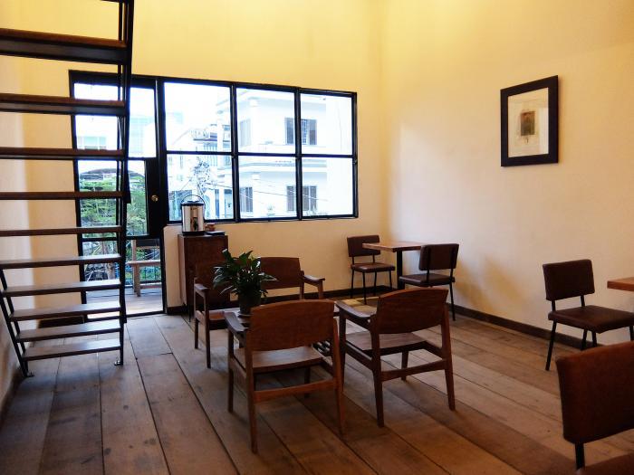 上の階のカフェエリア。再利用材の木をフローリングに使い、CLTで作ったロフトもあります。