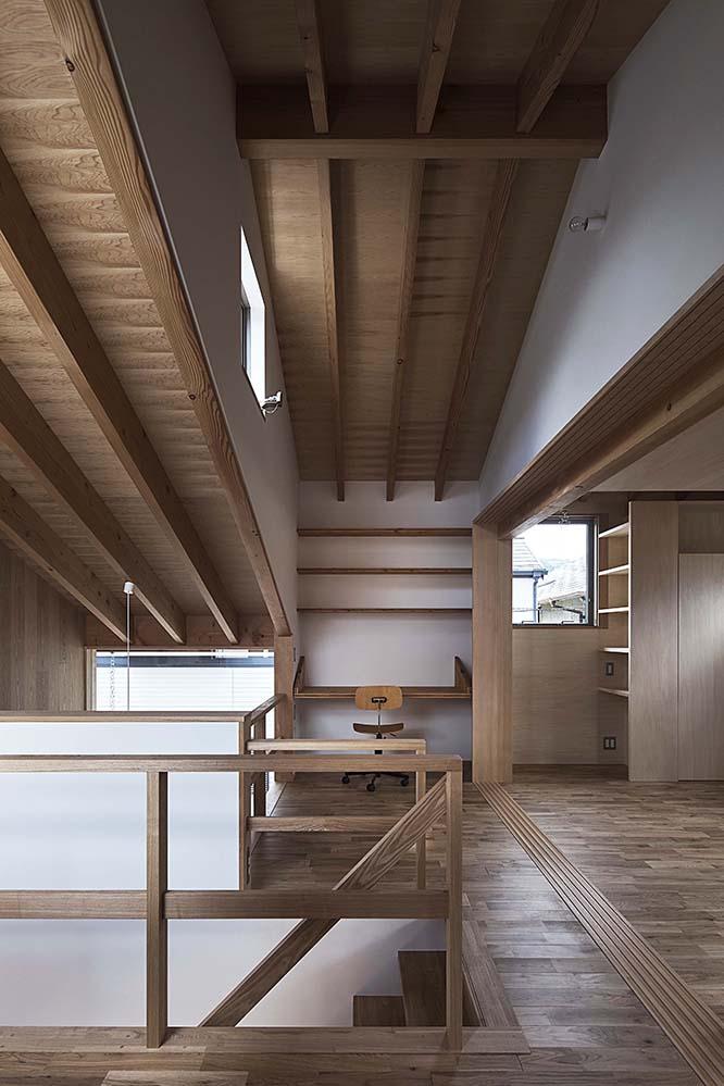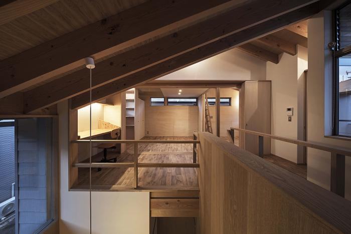 敷地は、兵庫県芦屋市の南に位置する。六甲山から芦屋浜へと注ぐ芦屋川の砂質土が堆積してできた扇状地と推測され、やや海に近い場所である。そのため地盤は若干軟弱ではあるが、芦屋の中では、比較的起伏の少ないなだらかな地形が形成されている。大きな通りから見ると、歩道から10mほど分岐した42条2項道路に接する。道路入口で幅員は2mを切る狭さで、重機類もほとんど入ることはできない。従って、当初から建て方も手上げになると想定し、大きな材がでないよう、できるだけ細切れなボリュームで計画を行った。結果として、4つに分けて棟を連続させ、施工性やローコスト化に配慮し、現状のヒューマンスケールな街路に沿って、両隣の建物と一体となって軒を連ねる形状をとっている。さらに、路地裏的な雰囲気をより強調する為、又、南側に出来るだけ広く庭を確保する為、天空率で道路斜線の緩和を受け、北側の道路境界際ギリギリまで建物を寄せている。そのため、道路幅員は法的に求められた拡張に対応しながらも、後退前の両隣の既存不適格建物との外壁面は綺麗に揃っている。ここで、分割されたボリュームのそれぞれに対し、道路斜線に抵触する箇所を中心に、天空率が有利に働くよう其々の棟の高さの再検討を行った。周囲に住宅が密集した地域であることから、開口部も、隣の家と重ならないよう、建物と建物の間に隙間が空いているところは、その余白を狙うよう調整している。道路に迫った建物は、通りに対し威圧的にならないよう、ファサードの南の空地や空へ向けて開きながら、ピロティやハイサイドライトをリズム感をもって配置してゆき、太陽の直射光の明るさと視線の抜けを北側道路まで引き込んだ。また、高さの異なる軒を連続させると共に、外壁のテイストも周囲と合わせることで、周辺環境との同一化を計っている。こうして1つの住宅の装いが、その場所の風景をなぞらえたかのように、街並みの中に上手くフィットしながら、狭い袋小路の環境全体を、より整った自然な様相へとアップデートすることができないかとス試みた。