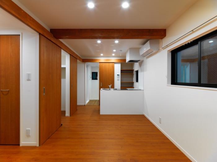 キッチン 扉はすべて引き戸にして、スペースを広く使えるようにしています
