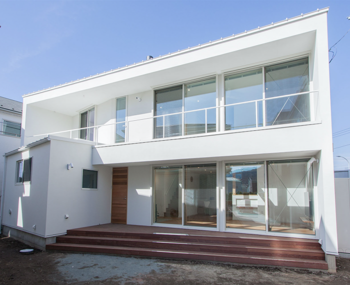 旗竿敷地で四方が建物に囲まれ少しこもった感じを改善したいとのリクエストから計画がはじまりました。通路の長さは15mを超え、敷地の奥は台形の変形敷地です。 建て主さんがこういう敷地だからこそ建築家に!と依頼してくれました。建物配置を工夫し、大開口を設け、陽の光、風の流れをデザインした住宅です。