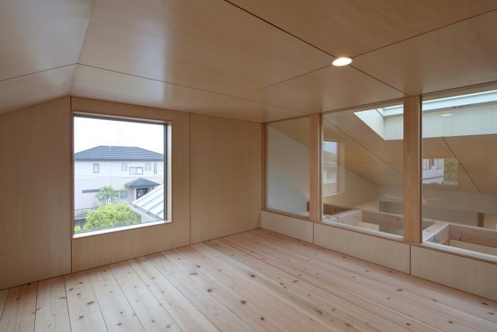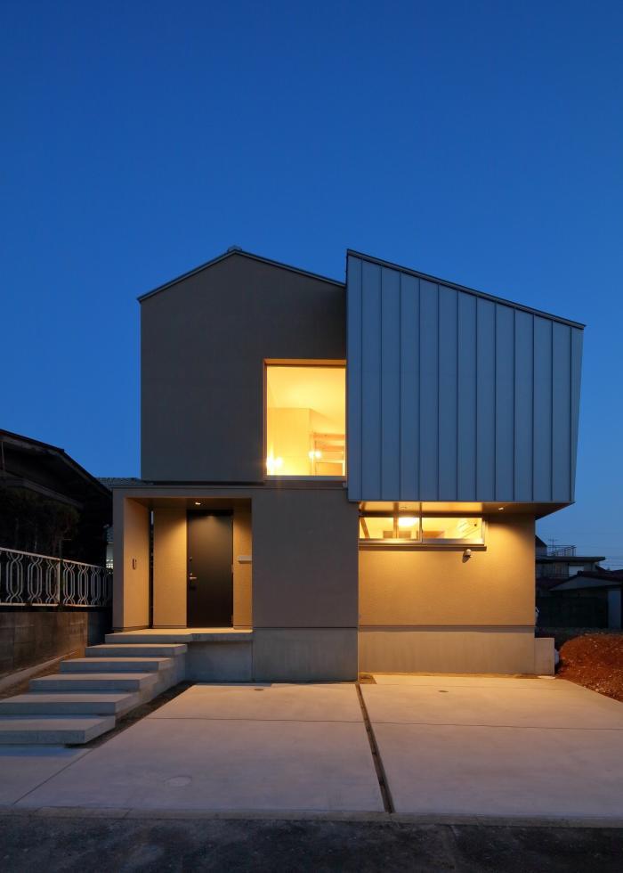 落ち着いた色の吹付仕上とガルバリウムの外壁で、大きなFIX窓が目立つ住宅です。片持ちのアプローチ階段から玄関に入ると、裏口まで土間でつながっており、壁・天井ともにシナ合板で仕上げた木の空間になっています。