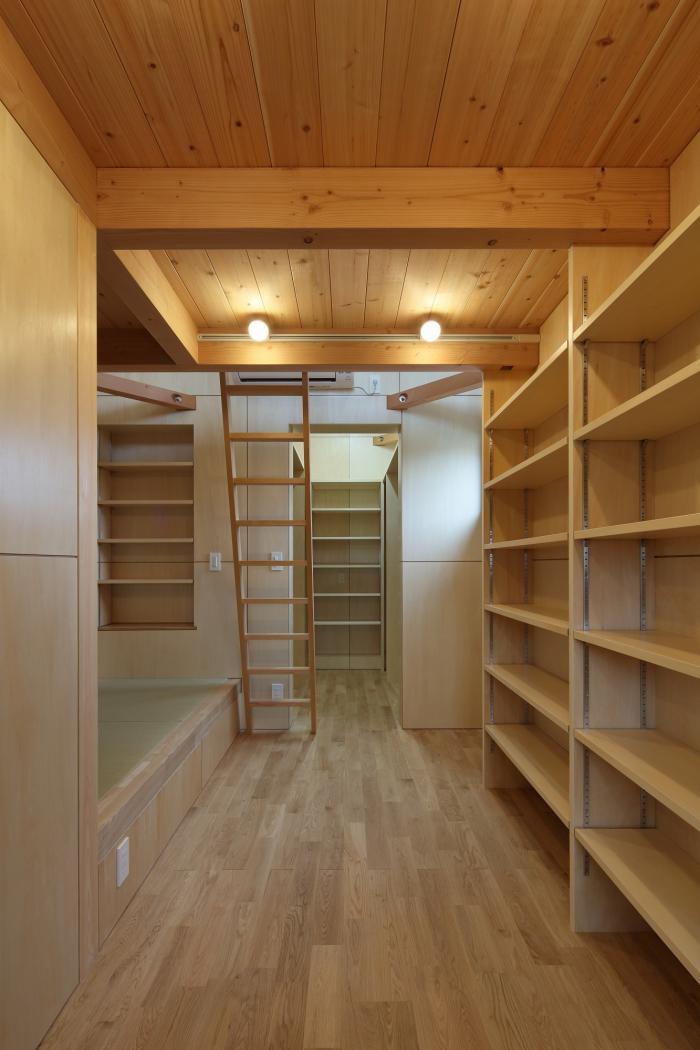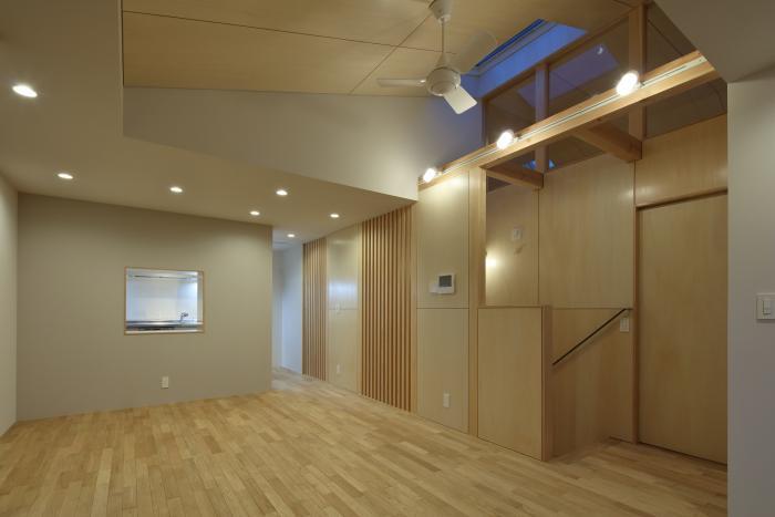 2FのLDKと1Fの玄関ホールはあえて壁や建具で仕切らず、玄関ホールもLDKの用途として使えるように空間を一体としています。また、2Fには家事室の他、ご主人の書斎兼プライベートルームがあり、ロフトを設けたりと、こだわりが詰まった隠れ家的な部屋となっています。