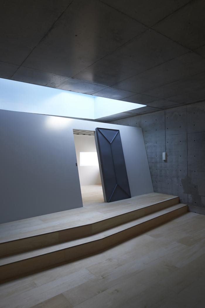 高密度な建物の密集した商業地域に設計した、ガレージハウス。外部に対してプライバシーを確保しつつも、柔らかい間接光が室内に降り注ぐ地下のような静かな空間。