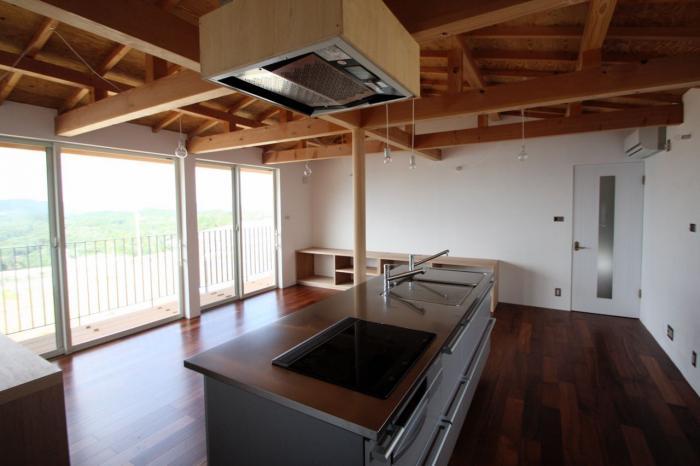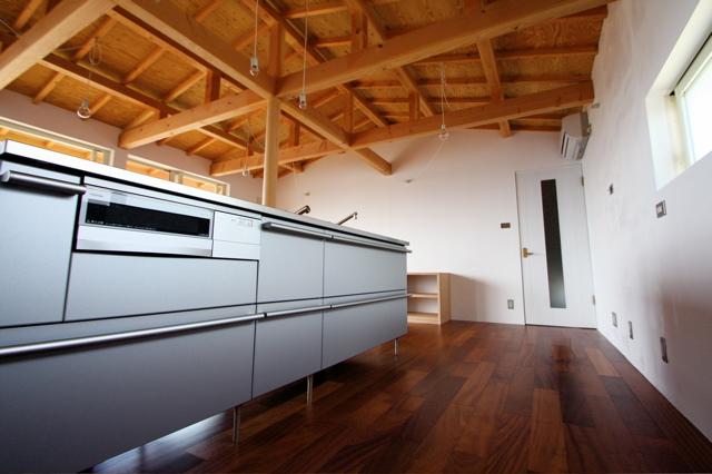 1階のLDKを見ています。天井は、構造材あらわし仕上げとしています。キッチンは、TOYOキッチンの既製品を使用しています。
