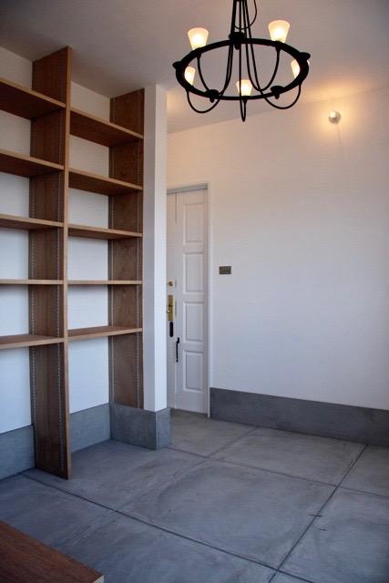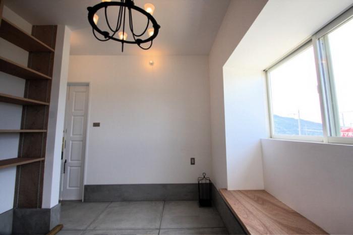 玄関を見ています。急な来客にもゆとりを持って接客できる玄関スペースをつくりたいと考えました。写真には、写っていませんが、右手には、ベンチ付きの出窓があって、遠くの山々を眺めることができます。