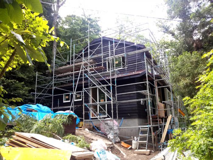 基礎も出来上がり、外部は竣工当時の杉の鎧張りに直してあります。間取りも移動出来ない柱を一部残して全く違うものに作り変えてあります。