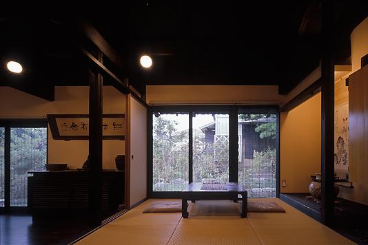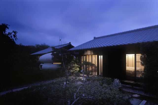 天竜川の近くに建つセカンドハウスです。川からの風が気持ちよく届けられる此の敷地は、むかし船問屋さんを営んで居られた場所で、よく手入れの施された広い庭の一角には古い蔵も残っていました。設計御依頼の時には「孫達が来た時の為に面白いお風呂を」というのが主なお話しで、5種類の計画案を提出させて戴いた末このシンプルな平屋の案に決まりました。風と緑の恩恵がどの部屋に居ても感じられる気持ちの良い家です。