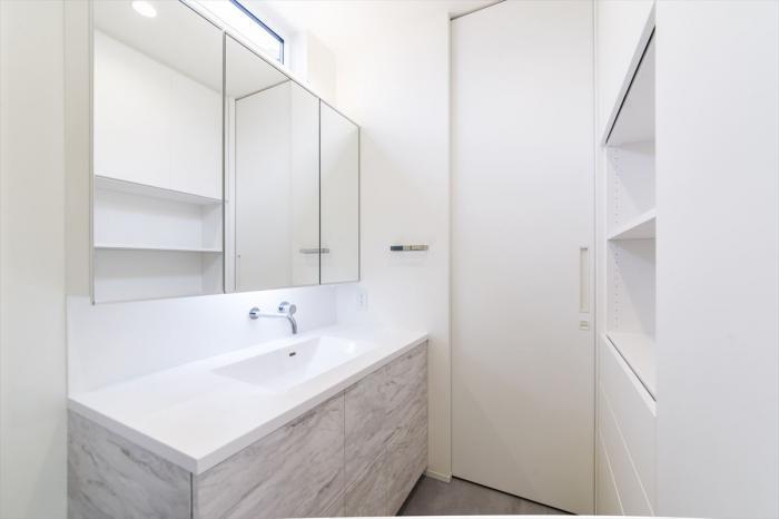 ホテルライクな洗面。たくさんの光が差し込んで明るい。
