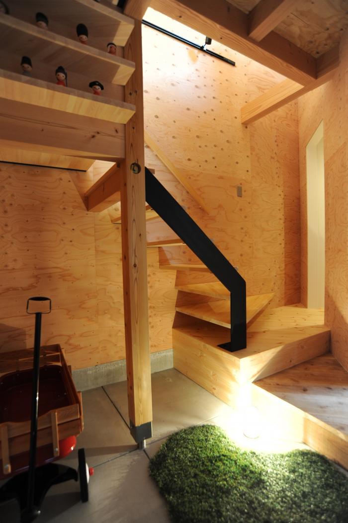 南・東を3階建ての住宅に囲まれた80㎡ほどの変形旗竿敷地に建つ住まい。 余った分譲地を更に細分化された結果残った敷地は変形し、周囲の住宅の窓が敷地に向かって開いています。空からの光を1階まで導くため、渓谷のような吹抜とトップライトに接する高い壁を設けました。