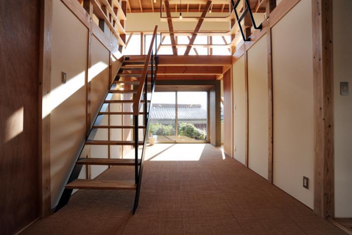 棚に支えられた吹抜の上のロフトは、ツリーハウスのようにこの家とまちなみに鎮座しています.