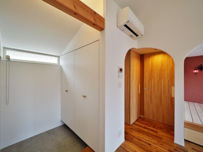内部については、賃貸部分はシンプルな作りとすることを心掛けて、オーナー宅については、依頼主の好みであるモロカンスタイルをイメージして計画しました。ビビットな赤や青などの塗り壁をアクセントで取り入れ、垂れ壁はアール形状としています。また、狭い面積でも広く感じるように間仕切りをできる限り少なくし、空間に広がりが感じられるように考慮しています。