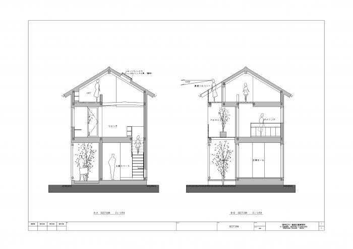 鎌倉の閑静な住宅地らしい落ち着いたデザインとし、バルコニー周りは格子を取り入れ、和風を意識させる。一方内部狭小ながらもLOFT、中庭等変化に富んだ内部空間を目指した。