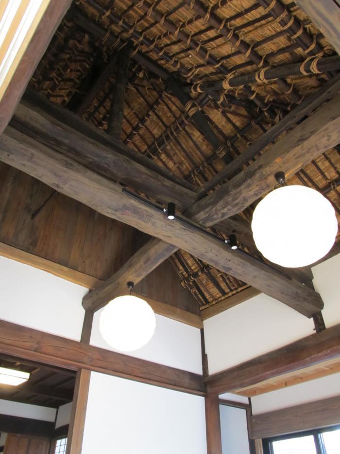 玄関土間の現しにした小屋裏。太い小屋梁と美しく組まれた茅葺き屋根の構造を見ることができます。