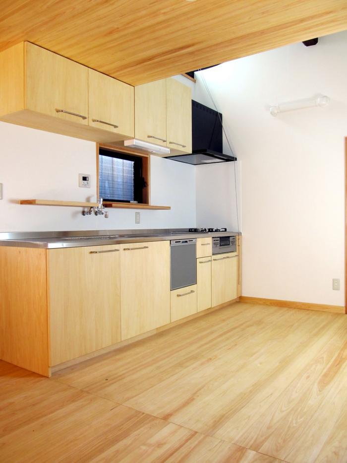 シンプルなシステムキッチンを設置し、高窓から光を入れたキッチン。