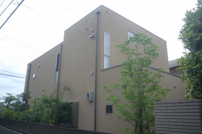 角地ですが風致地区に指定されているため、道路境界と隣地境界からそれぞれ2メートルと1メートルの壁面後退が義務付けられ、さらに景観計画区域に指定されているため、敷地面積の10%以上の緑化が義務付けられている厳しい条件の土地に建っています。