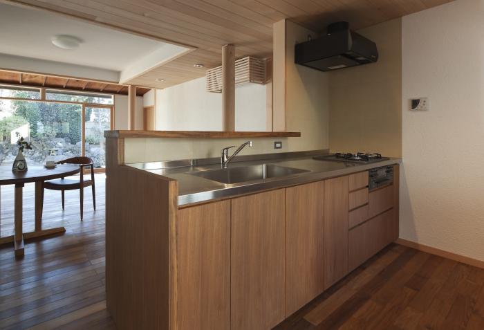 南は木製建具で大きな開口部を取り、さんさんと太陽の光を取り入れ、現代風に整備された庭との繋がりを重視しました。と同時に北側のダイニングキッチンまで光が届くよう、壁、天井の一部を白のざっくりした左官仕上げとし光を拡散させています。