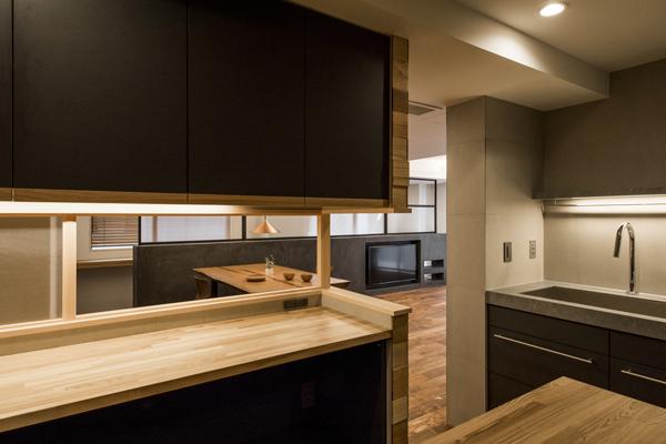 キッチンよりリビングをみる(夕景)。I型のメインカウンターとL型+センター配置のサブカウンター。