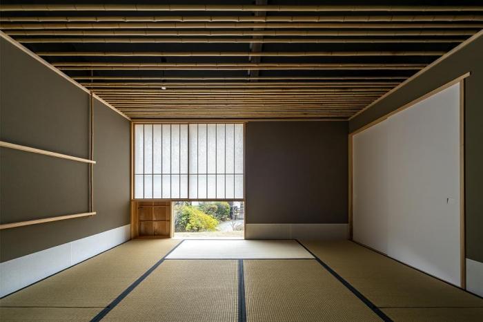 天井を張らない形式が総屋根裏で、「わび」に徹した表現である事や、広間の茶室では平天井が基本となる事を考慮し、天井へはピッチを変えた竹のルーバーを配し、その屋根裏側へ設備機器を集約する事としました。