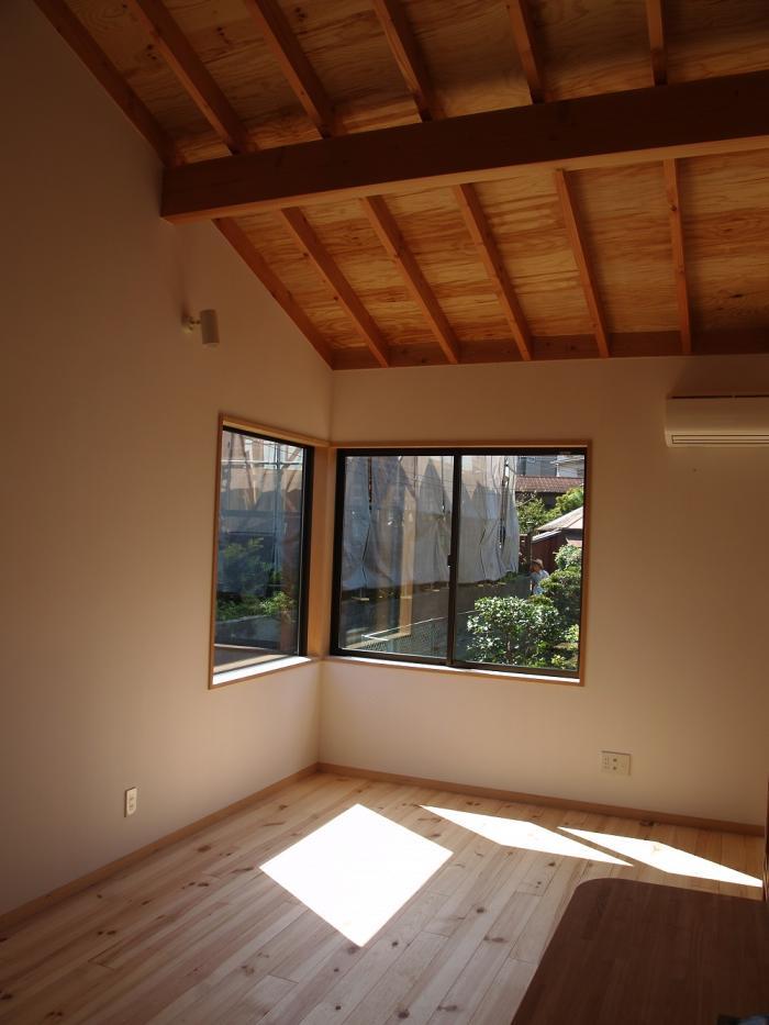 葉山海岸へ10分程の山あいの敷地。家族4人のための住まいです。敷地は道路より1.5m程高くなっているため、道路レベルからアプローチできる半地下の玄関として同レベルに音楽室と客間を設けました。半地下はコンクリートでその上は木造の2階建てです。建物の中央の1階にはパティオ、2階には展望テラスがあり、十分な採光と通風を確保しています。1階は、天井の高いリビングを中心にダイニングキッチン、寝室、水回り、2階には子供部屋を配置しました。コンクリートで囲まれた防音性のある音楽室は、ご主人がギターを弾きながら作曲する趣味の部屋で、ご近所を気にすることなく思う存分楽しんでいます。