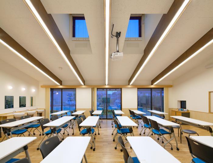 新施設は既存施設の機能を補完し、所員増によるスペース不足を解消することを目的に、施設全体の核となるように計画しています。1階は管理部門(職員室、所長室)と大空間の多目的室(ランチルーム)、厨房等で構成され、2階は生活支援、宿泊支援できる戸建て住宅に近い内容です。