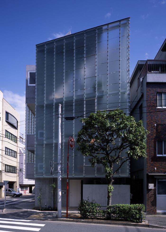 20坪と決して広くない敷地に、様々の方向から視線が集まるため、光と風を通すように納めた半透明の波板ガラスで覆い、住空間を外部視線から守りました。