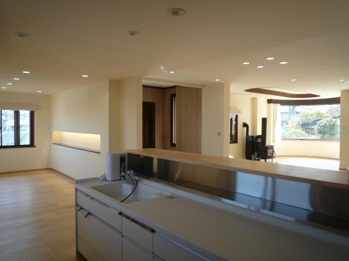 ダイニングやリビング、玄関側が見渡せるキッチン。システムキッチンに水切り棚を大工工事で造作して使い勝手を向上させました。併せて上部をオープンにして開放的な作りにしました。
