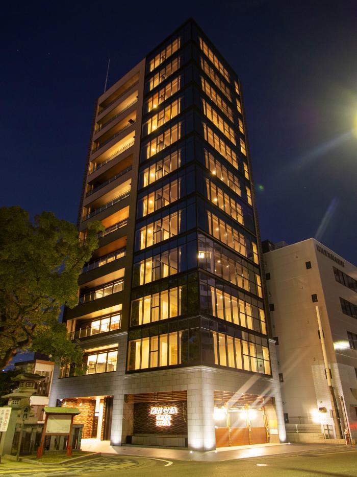 低層部は石を基調とした外装に木彫建材を使用し、敷地内には樹木や石庭を配する事で住吉神社の持つ歴史的なイメージに馴染ませます。