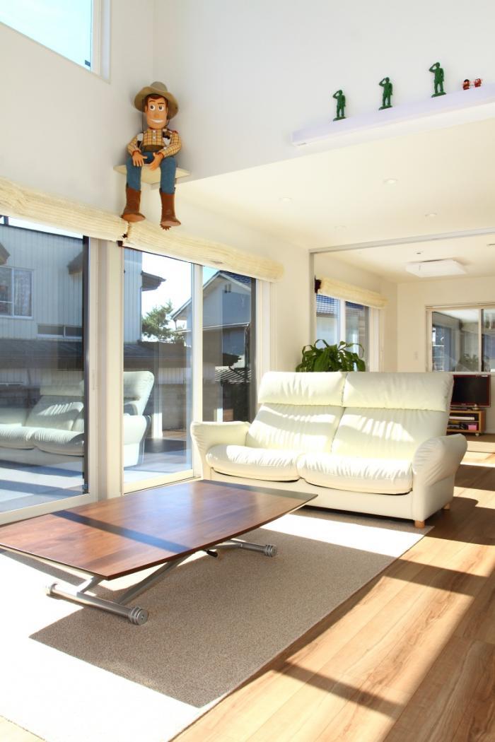 吹き抜けのリビング。ディズニー好きの施主様の為ウッディの空中椅子を設けました。
