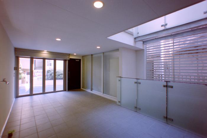 敷地は都心の住宅密集地、20坪弱の狭小地です。写真は1階の駐車スペース。中庭的吹抜け空間と一体のオープンな外部空間で、地下ドライエリアへの落下防止の手摺を設けています。