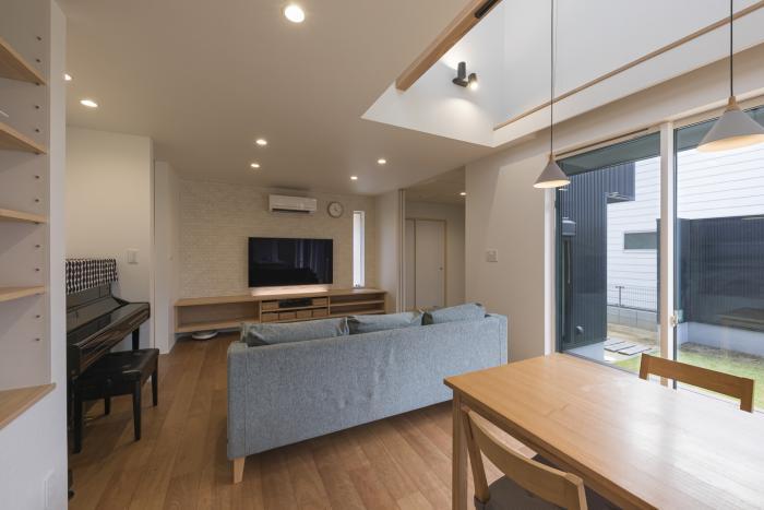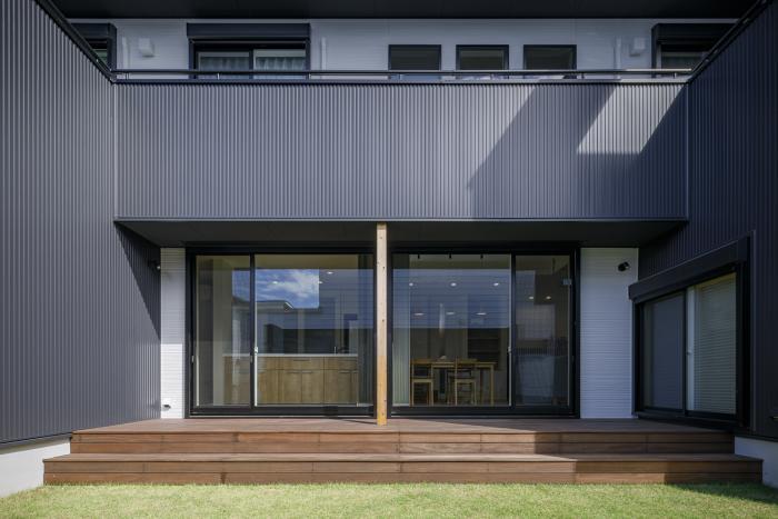 郊外に建つ専用住宅。 モノトーンなガルバリウムの外壁に天然木の温かみをプラス。 ファサードは高さを抑えた緩勾配屋根で、建物の間口をより広く見せてくれます。 一階は道路側の開口部を極力少なくし、プライバシー性を高めています。 ”コノジ”とは”コの字”の事で中庭を中心にコの字型のプランとし、人目を気にせずリビングに面した庭を楽しめる家になりました。コロナ禍でお家時間が増えた昨今の生活スタイルにもフィットしています。