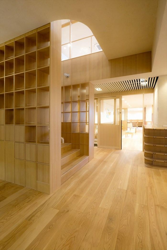 内部は、木と土による柔らかい雰囲気の仕上とした。ハイサイドからの包まれるような光と共に温かみの感じられる保育空間を創出している。