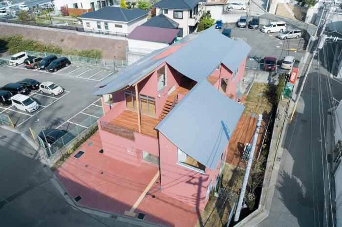 外観写真。ひな壇状の街並みに呼応する段状テラスを、木の湾曲屋根が覆っています。