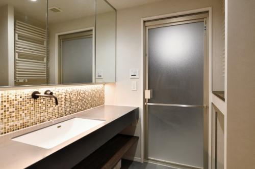 洗面脱衣室。洗面台はアイカのオーダー品を利用した造作洗面台。ミラー収納は既存利用。