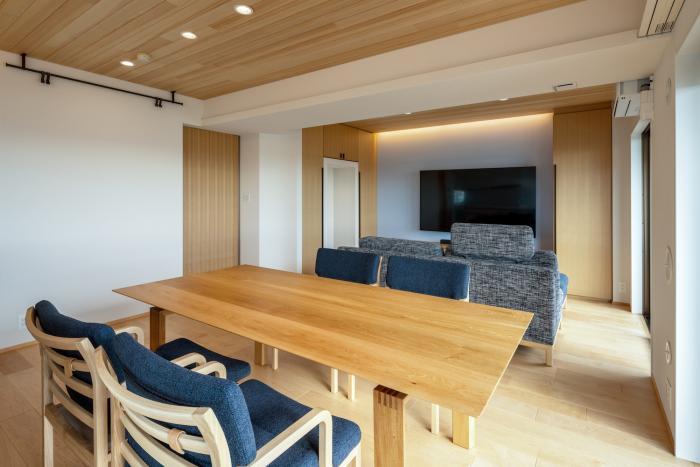リビング部分です。内装と家具の色調を統一し、間接照明で柔らかい空間にしています。