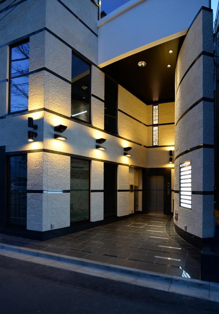 アプローチの正面にあるエレベーターと、2階テナントへの階段です。