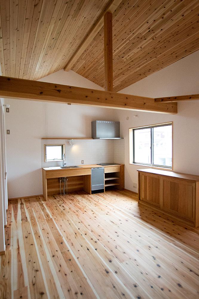 キッチンも造作で造り、天板はお客さんの希望で山桜のカウンター板としました。