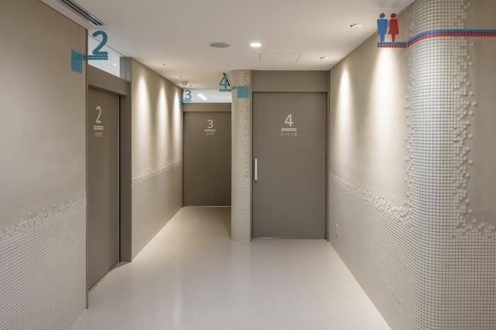 ブランディングを強化する共通言語(ドッド)によるデザインとして、壁の出隅角部分に丸形のモザイクタイルを施しています。これは来院者が滞在する待合空間を良好な空気環境とするために採用した吸湿・消臭性能を持つ自然素材の塗り壁に対して、車いすやストレッチャーなどの衝突保護のための機能性を有しており、機能性とデザインが統合した建築的ブランディングとなっています。