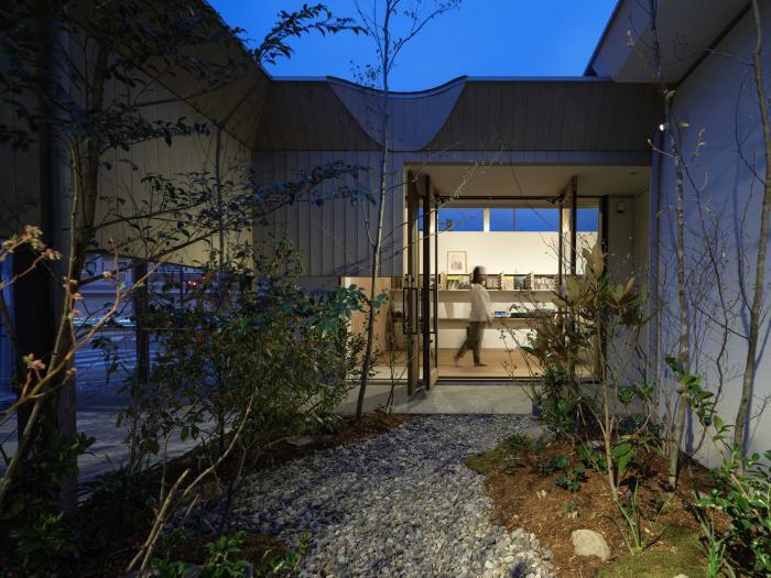 中庭には垂れ壁を設けることで、プライバシーにも配慮しています。夜になると照明によって照らされた木の影がアプローチに映えます。