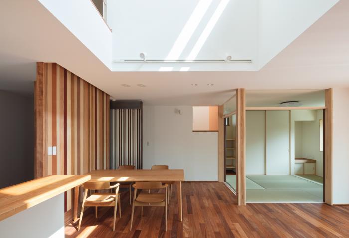 木造2階建ての事務所併用住宅のLDKです。正面のモスグリーンの壁面が南側です。南側には広い駐車場があり、プライバシーを確保する為に南面には極力窓を設けておりません。その代りに、1階東面に大きな開口を取り、吹抜けの2階東面にも大きな開口を取る事で明るいLDKとなっています。吹抜けには子供室が面しており、声や気配が届くようになっています。