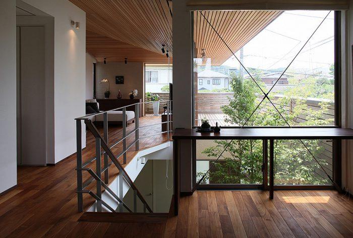 南北に縦長の土地を活用したコの字プランの2階リビングから中庭横を通る階段。階段にすることで上下階に中庭からの光を取り入れることができます。
