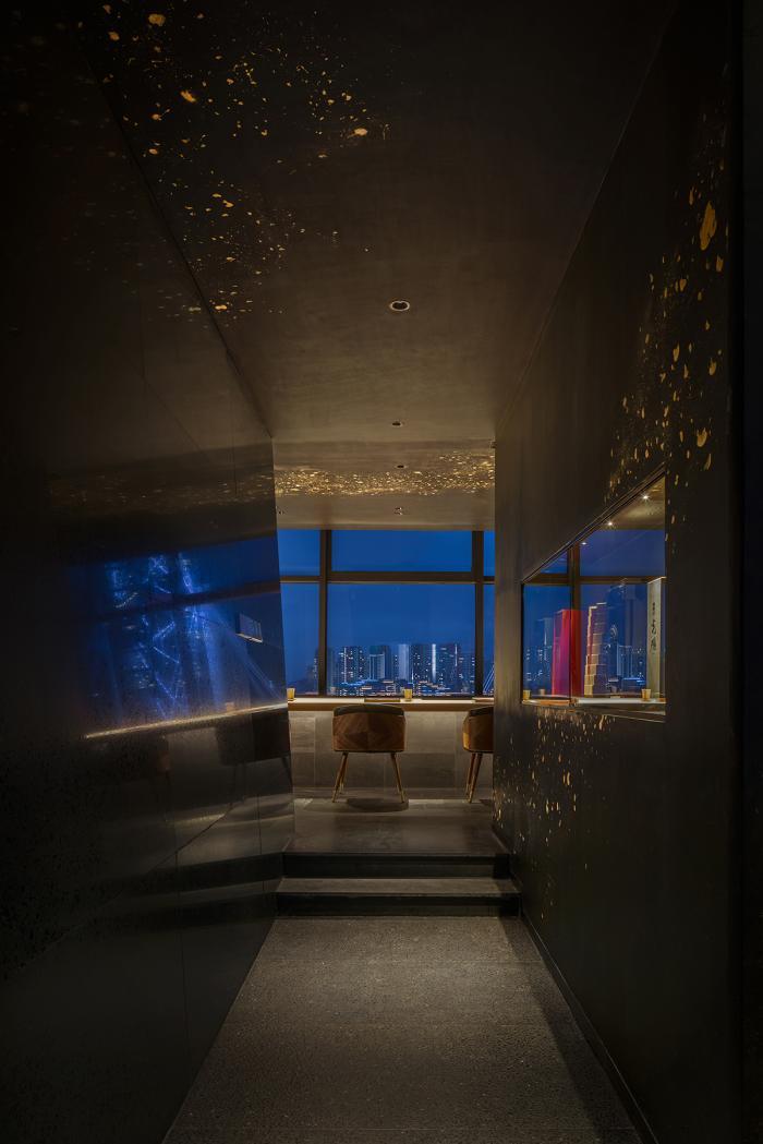 広東省仏山市の商業開発区の展望タワー最上階を寿司ラウンジへ改装することになった。眼前の消費社会を象徴するような煌びやかな光景を眺めつつ、対照的に落ち着いた高級感を如何に作るか。我々は谷崎潤一郎の冒頭の文章を拠り所とし、室内のほとんどを黒い素材で構成して漆黒の闇を作り、その奥に屋外の光を捉えて浮き上がる黄金を想像して、これを「沈痛な美しさ」として見せることとした。
