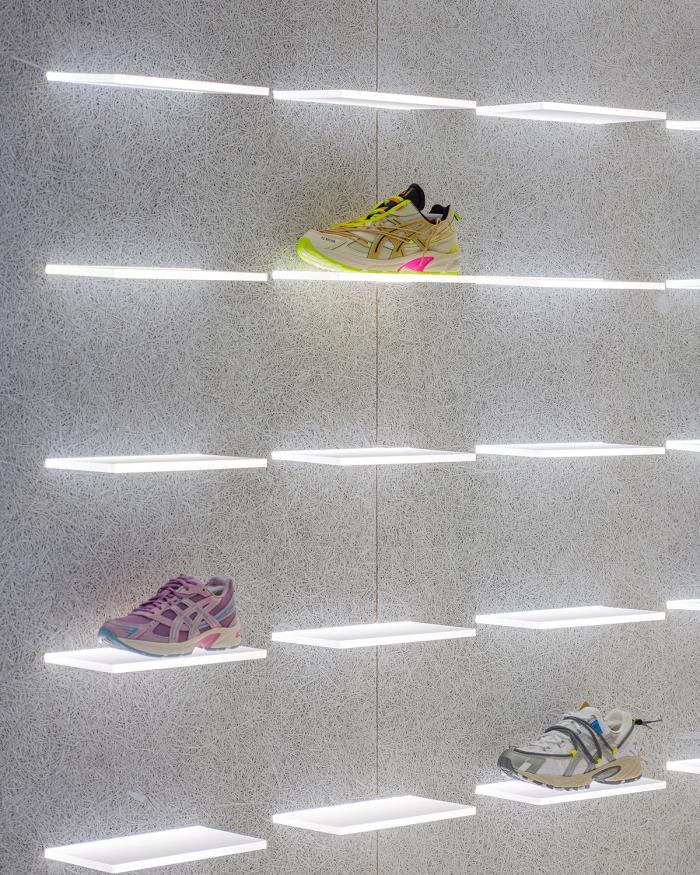 1階は主にシューズがディスプレイされる。テクノロジーに裏付けされた商品にふさわしいインダストリアルな空間を意識し、テラゾー、木毛セメント板、鏡面ステンレス、木目プリントのアルミルーバーなどの工業製品を採用し、壁面にはLEDディスプレイを設置した。シューズ売り場は木毛セメント板の半円形の壁面で覆われ、発光するアクリル板上に商品が陳列される。鏡面ステンレスの天井により発光アクリル板が反復され、近未来的な売り場を作り出す。奥には試着室があり、エンボス加工のステンレスが青白い光で照らされ、海中のような不思議な体験をすることができる。