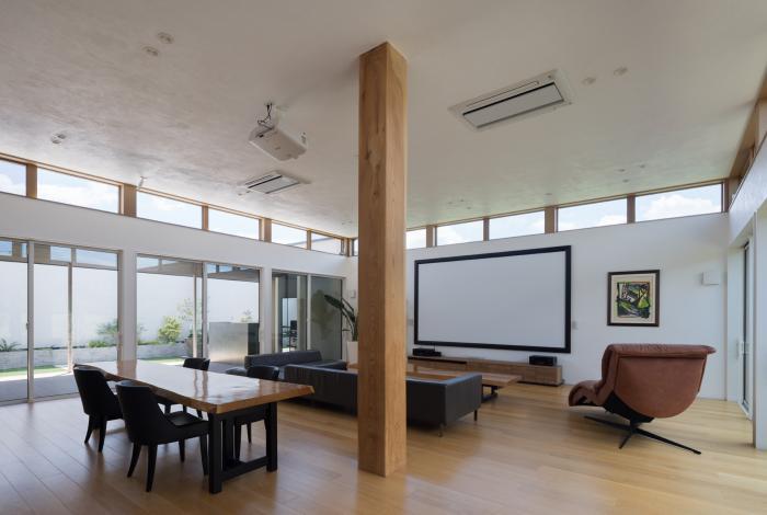46帖のLDKは、東側の同じ広さの中庭と、西側の18帖の広さの中庭で挟み込んでいます。