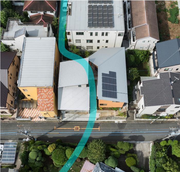 隣地の緑地帯から、敷地内を貫通して道路まで貫通する長い通り道は、敷地を超えた自然環境の帯を地域にもたらします。 豊かさをもたらす通り道は、敷地を超えた隣家間にも広がり、未来に残る地域風景の一つとなる可能性を感じさせます。