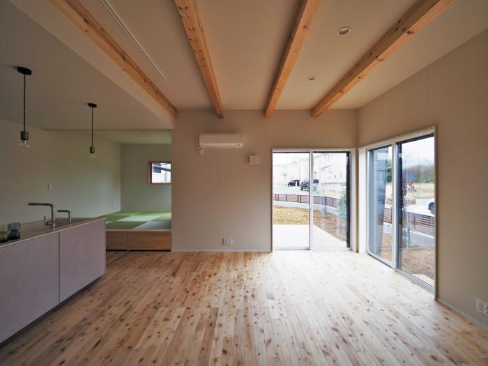 少し高めの天井で長手方向に化粧梁をとばすことでのびのびとした空間になっています。