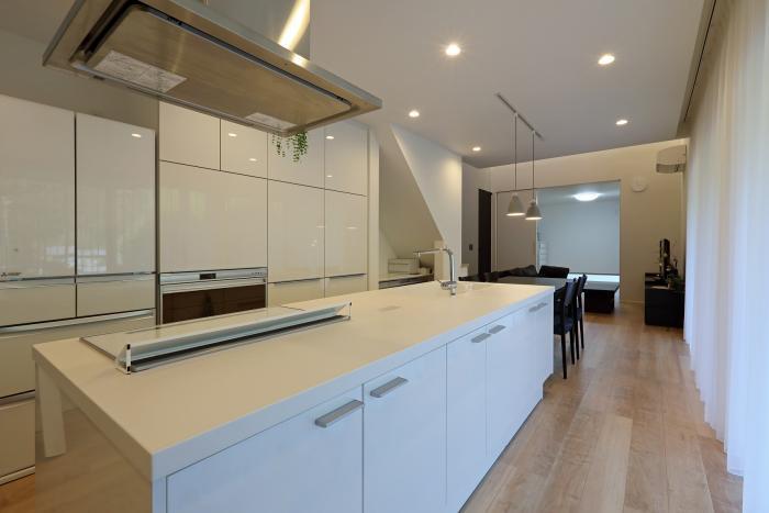 キッチン背面の収納は空間全体に馴染むようにホワイトカラーで統一して家電が隠れるタワー型での採用と冷蔵庫の出っ張りもないように壁厚を調整し一体化を図る工夫を
